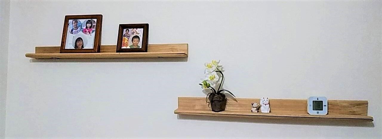 押し入れすのこ板を再利用してウォールシェルフ作りました。 孫の写真などを飾ってます。