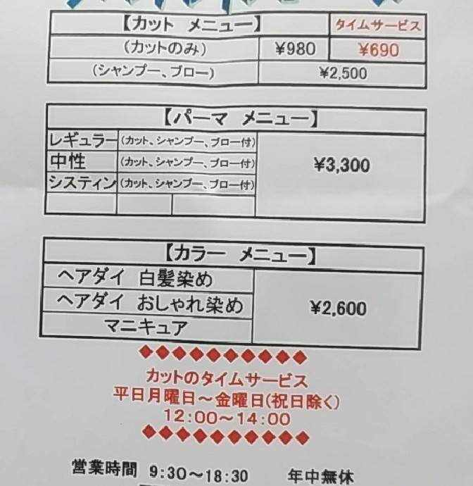 この美容院は平日12~14時まで、タイムサービスカット690円というのをやってましたが、